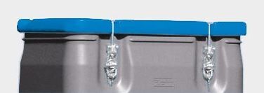 Der brandklassifizierte Deckel wird mit einer PU-Dichtung ausgestattet und ist dadurch licht- und luftdicht. Dadurch ist die Box auch für feuchtigkeitsempfindliche Stoffe geeignet. Den Deckel gibt es in verschiedenen Farben: Orange (11457), Rot (11458), Grün (11459), Blau (11460). Dazu verfügt der Deckel über einen abschließbaren Mechanismus mit Metallbügel und Arretierfeder.