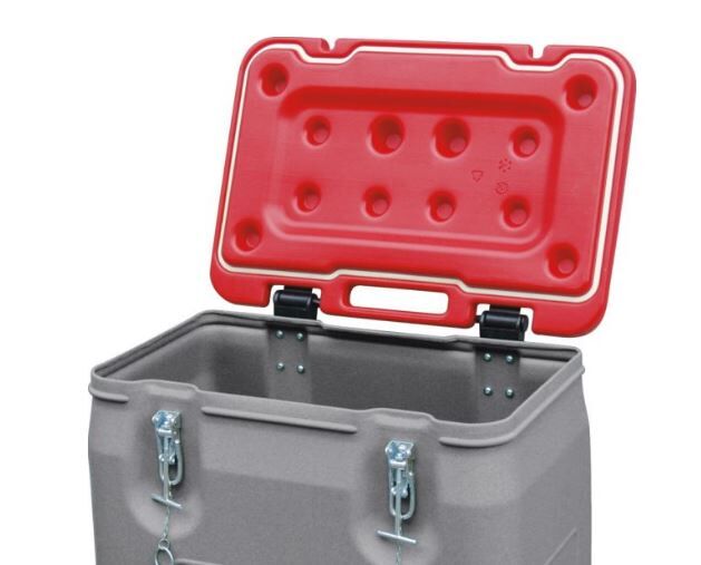 Der brandklassifizierte Deckel wird mit einer PU-Dichtung ausgestattet und ist dadurch licht- und luftdicht. Dadurch ist die Box auch für feuchtigkeitsempfindliche Stoffe geeignet. Den Deckel gibt es in verschiedenen Farben: Orange (11457), Rot (11458), Grün (11459), Blau (11460). Dazu verfügt der Deckel über einen abschließbaren Mechanismus mit Metallbügel und Arretierfeder.