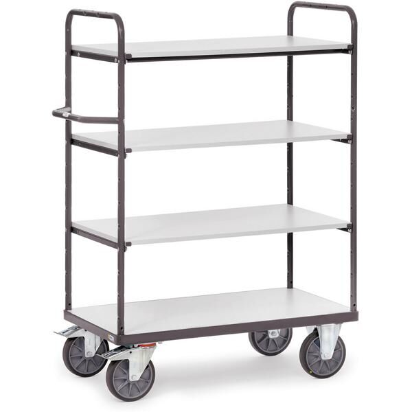 - mit 2 Lenk- und 2 Bockrollen (Ø 200 x 40 mm), Räder mit TPE-ESD-Bereifung (elektrisch leitfähig), Naben mit Präzisions-Rillenkugellager, Feststeller an den Lenkrollen
