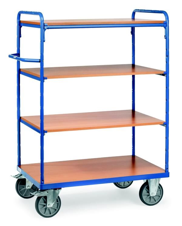 Das multifunktionale Fetra Baukastensystem aus Profilstahl- / Stahlrohrkonstruktion mit dem bewährten Steck- und Schraubprinzip für einen unkomplizierten, handlichen Transport bis zu 600 kg. Diese Etagenwagen lassen sich vielfach verändern, austauschen und ergänzen. Die Systemteile werden einfach in den Basiswagen eingesteckt und festgeschraubt. Die Stirnwände sind entweder offen oder mit senkrechten Rohrstreben, damit nichts durchfallen kann. Der Schiebegriff kann beidseitig angeschraubt werden, der Wagen ist aber auch ohne Griff zu verwenden. Mit variabel einsetzbaren Einlegeböden aus tragfähigen, biegesteifen Sandwichplatten, Oberfläche Buchendekor, Kanten mit PVC-Umleimer oder mit Einlegekästen aus Holzwerkstoffplatten, Oberfläche Buchendekor. Die Bodenträger sind nach Bedarf im Raster von 100 mm einschraubbar. Serienmäßig mit 2 Lenk- und 2 Bockrollen, Räder mit TPE-Bereifung, Naben mit Rillenkugellager. Feststeller an den Lenkrollen. Hochwertige Pulverbeschichtung in brilliantblau RAL 5007.