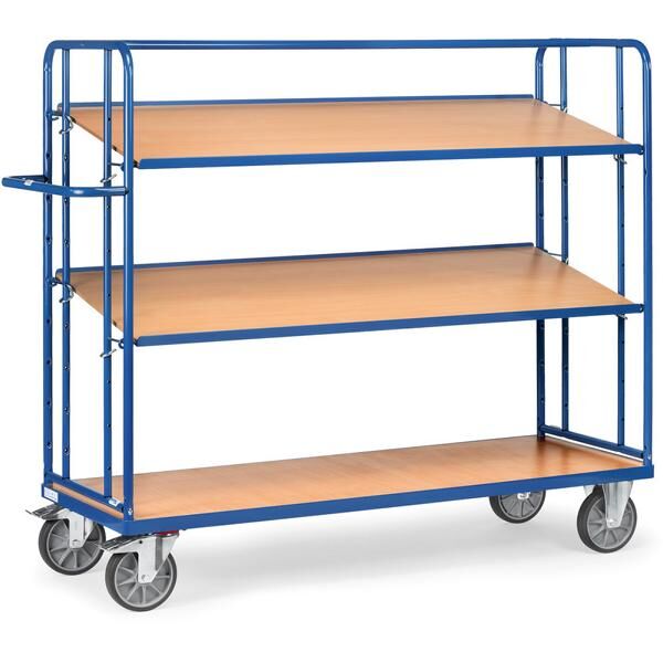 Das multifunktionale Fetra Baukastensystem aus Profilstahl- / Stahlrohrkonstruktion mit dem bewährten Steck- und Schraubprinzip für einen unkomplizierten, handlichen Transport bis zu 500 kg. Diese Etagenwagen lassen sich vielfach verändern, austauschen und ergänzen. Die Systemteile werden einfach in den Basiswagen eingesteckt und festgeschraubt. Die Stirnwände sind entweder offen oder mit senkrechten Rohrstreben, damit nichts durchfallen kann. Der Schiebegriff kann beidseitig angeschraubt werden, der Wagen ist aber auch ohne Griff zu verwenden. Mit variabel einsetzbaren Einlegeböden aus tragfähigen, biegesteifen Sandwichplatten, Oberfläche Buchendekor, Kanten mit PVC-Umleimer oder mit Einlegekästen aus Holzwerkstoffplatten, Oberfläche Buchendekor. Die Bodenträger sind nach Bedarf im Raster von 100 mm einschraubbar. Serienmäßig mit 2 Lenk- und 2 Bockrollen, Räder mit TPE-Bereifung, Naben mit Rillenkugellager. Feststeller an den Lenkrollen. Hochwertige Pulverbeschichtung in brilliantblau RAL 5007.