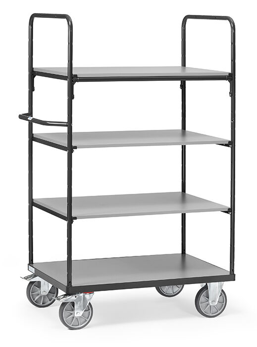 Der fetra Etagenwagen bietet eine gefällige und robuste Stahlrohr-Profilstahl-Konstruktion für den unkomplizierten Transport bis 600 kg. Der Wagen verfügt über einen festen und drei variabel einsetzbare Einlegeböden (m Raster von 100 mm). Diese bestehen aus tragfähigen, biegesteifen Sandwichplatten. Mittels verschraubbarer Versteifungstreben kann man die Tragkraft der Böden von 90 kg auf 150 kg erhöhen. Die Wagen lassen sich durch Zusatzböden weiter varieren. Der waagerechte Schiebegriff kann beidseitig angeschraubt werden, der Wagen ist aber auch gut ohne Griff zu verwenden. Durch das bewährte Steck- und Schraubprinzip lassen sich die MultiVario Basiswagen mittels verschiedener Systemteile mühelos vielfach verändern, austauschen und ergänzen. Die serienmäßige TPE-Bereifung sorgt für eine angenehme Leichtgängigkeit und entspricht der Europäischen Norm EN 1757-3 (Sicherheit von Plattformwagen).