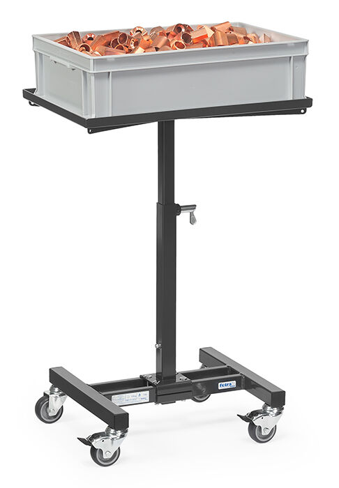 Der fetra Materialständer besteht aus einer gefälligen und robusten Profilstahl-/Rohr-Konstruktion mit Stahlblechplattform und eignet sich für den unkomplizierten Transport bis 150 kg. Diese Wagen sind unter anderem besonders für Kunststoffkästen, Stahlblechkästen und Drahtkörbe geeignet. Ein vieilseitiges und komfortables Handling wird durch die Höhenverstellbarkeit und das Fahren auf Rollen gewährleistet. Die Plattform hat einen allseitigen Rand mit 20 mm Höhe. Sie ist nicht neigbar, lässt sich aber im Raster von 25 mm zwischen 720 - 995 mm höhenverstellen. Die serienmäßige TPE-Bereifung (4 Lenkrollen, davon 2 mit Feststeller) sorgt für eine angenehme Leichtgängigkeit und entspricht der Europäischen Norm EN 1757-3 (Sicherheit von Plattformwagen).