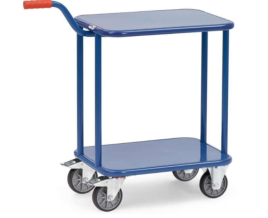 Unsere Fetra Roller gibt es in verschiedenen Ausführungen, darunter Griffroller in gefälliger Stahlrohr-Konstruktion mit Einhandbedienung für den schnellen Kleintransport bis 250 kg. Die Plattformen wahlweise mit Rohrstreben, mit eingeschweißtem Stahlblech, mit Kunststoffmulde / -kasten oder mit in den Rahmen liegenden Holzwerkstoffplatten, Oberfläche Buchendekor. Serienmäßig mit 1 oder 2 Lenk- und 2 Bockrollen, Räder mit TPE-Bereifung, Naben mit Rillenkugellager. Feststeller an den Lenkrollen. Hochwertige Pulverbeschichtung in brilliantblau RAL 5007.