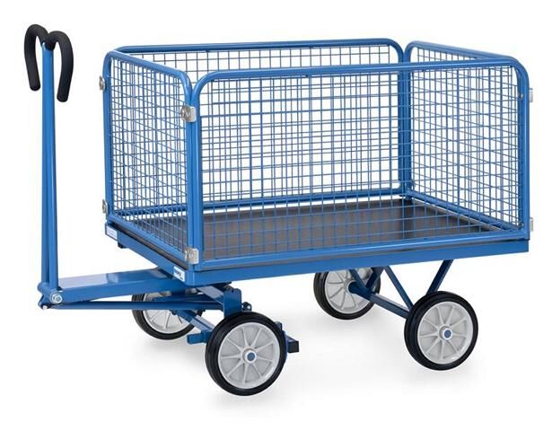 Unsere Handpritschenwagen sind optimal geeignet für einen unkomplizierten Transport bis zu 1500 kg. Die Ladefläche besteht aus einer rutschsicheren und wasserfesten Siebdruckplatte. Des weiteren besteht der Wagen aus einem Drehschemel mit Kugelkranz und einer Sicherheits-Deichsel mit automatisch gedämpfter Rückstellung in Ruhestellung. Der Handgriff hat einen Haut-sympathischen Softgrip-Bezug, welcher druckentlastend und isolierend wirkt. Serienmäßig mit großen Vollgummi- oder Lufträdern mit Stahlblechfelgen und Rollenlager in den Naben für leichten Lauf und lange Lebensdauer. Automatische Feststellbremse auf die Vorräder wirkend. Aus Profilstahl und Stahlrohr geschweißt. Hochwertige Pulverbeschichtung in brilliantblau RAL 5007. Optional mit formschönen, äußerst soliden Bordwänden mit Stahlrohrrahmen und Füllungen aus wasserfestem Sperrholz und nachstellbaren Kastenverschlüssen oder 4 Stahlrohrwänden mit Drahtgitterfüllungen 600 und 1000 mm hoch.