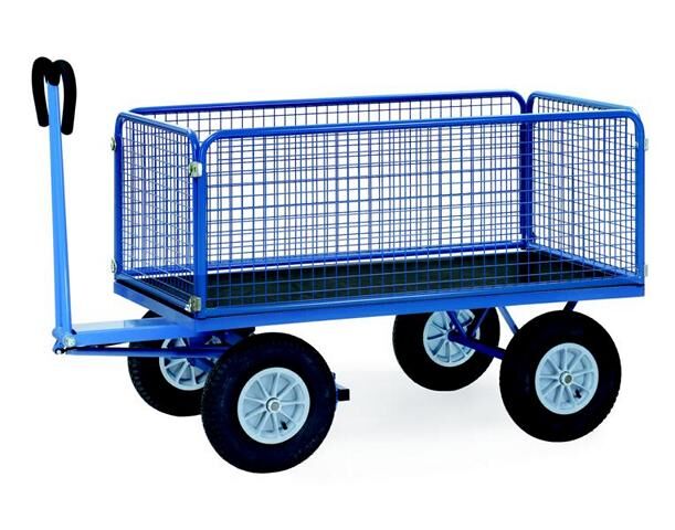 Unsere Handpritschenwagen sind optimal geeignet für einen unkomplizierten Transport bis zu 1500 kg. Die Ladefläche besteht aus einer rutschsicheren und wasserfesten Siebdruckplatte. Des weiteren besteht der Wagen aus einem Drehschemel mit Kugelkranz und einer Sicherheits-Deichsel mit automatisch gedämpfter Rückstellung in Ruhestellung. Der Handgriff hat einen Haut-sympathischen Softgrip-Bezug, welcher druckentlastend und isolierend wirkt. Serienmäßig mit großen Vollgummi- oder Lufträdern mit Stahlblechfelgen und Rollenlager in den Naben für leichten Lauf und lange Lebensdauer. Automatische Feststellbremse auf die Vorräder wirkend. Aus Profilstahl und Stahlrohr geschweißt. Hochwertige Pulverbeschichtung in brilliantblau RAL 5007. Optional mit formschönen, äußerst soliden Bordwänden mit Stahlrohrrahmen und Füllungen aus wasserfestem Sperrholz und nachstellbaren Kastenverschlüssen oder 4 Stahlrohrwänden mit Drahtgitterfüllungen 600 und 1000 mm hoch.