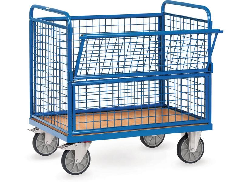 Unsere Kastenwagen bieten wir Ihnen in verschiedenen Ausführungen an, darunter Holzkastenwagen, Drahtkastenwagen und Blechkastenwagen. Diese Transportwagen eignen sich besonders gut für alles, was sicher aufbewahrt werden muss, durch 2 Verschlusssysteme: zweckmäßiger Stangenverschluss abschließbar mittels Vorhängeschloss oder eleganter Treibriegelverschluss mit Schwenkhebel und Zylinderschloss. Wahlweise offen oder mit Doppelflügeltüren erhältlich. Einlegeböden aus tragfähigen, biegesteifen Sandwichplatten, Oberfläche Buchendekor, Kanten mit PVC-Umleimer. Die Bodenträger sind im Raster von 100 mm einschraubbar. Die Wände, Dach und Türen sind wahlweise in engmaschigem Drahtgitter, verzinktem Stahl- oder Aluminiumblech erhältlich. Serienmäßig mit 2 Lenk- und 2 Bockrollen, Räder mit Vollgummi oder TPE-Bereifung (thermoplastisches Elastomer), Naben mit Präzisions-Rillenkugellager, geräuscharmer Lauf auf ebenen Böden. Reifen nicht kreidend. An den Lenkrollen TOTALSTOP-Zentralbremssytem. Hochwertige Pulverbeschichtung in brilliantblau RAL 5007. Optional gibt es ein Sondermodell mit hochwertigem Rolladenverschluss aus Aluminium.