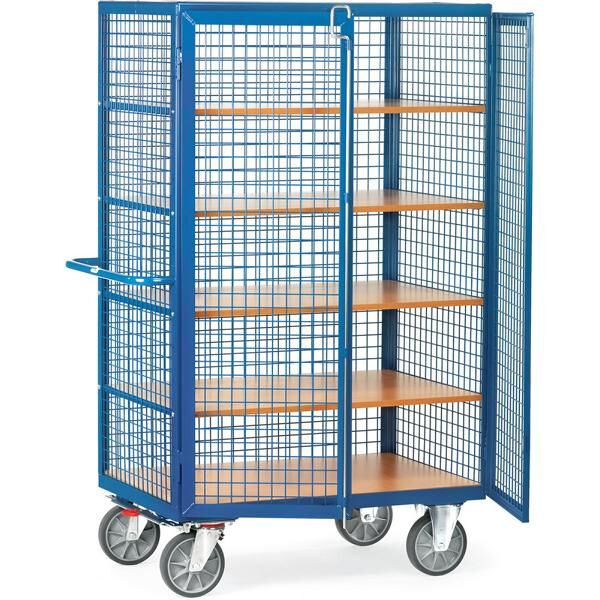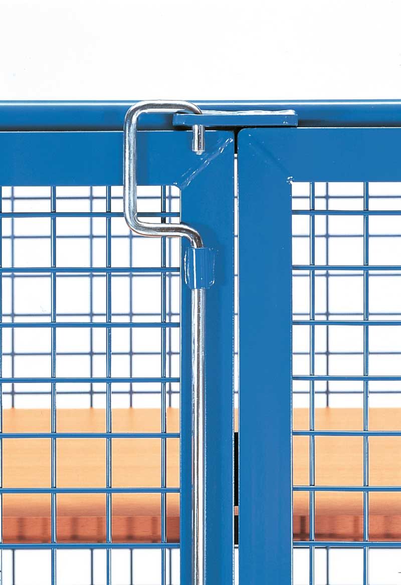 Unsere Kastenwagen bieten wir Ihnen in verschiedenen Ausführungen an, darunter Holzkastenwagen, Drahtkastenwagen und Blechkastenwagen. Diese Transportwagen eignen sich besonders gut für alles, was sicher aufbewahrt werden muss, durch 2 Verschlusssysteme: zweckmäßiger Stangenverschluss abschließbar mittels Vorhängeschloss oder eleganter Treibriegelverschluss mit Schwenkhebel und Zylinderschloss. Wahlweise offen oder mit Doppelflügeltüren erhältlich. Einlegeböden aus tragfähigen, biegesteifen Sandwichplatten, Oberfläche Buchendekor, Kanten mit PVC-Umleimer. Die Bodenträger sind im Raster von 100 mm einschraubbar. Die Wände, Dach und Türen sind wahlweise in engmaschigem Drahtgitter, verzinktem Stahl- oder Aluminiumblech erhältlich. Serienmäßig mit 2 Lenk- und 2 Bockrollen, Räder mit Vollgummi oder TPE-Bereifung (thermoplastisches Elastomer), Naben mit Präzisions-Rillenkugellager, geräuscharmer Lauf auf ebenen Böden. Reifen nicht kreidend. An den Lenkrollen TOTALSTOP-Zentralbremssytem. Hochwertige Pulverbeschichtung in brilliantblau RAL 5007. Optional gibt es ein Sondermodell mit hochwertigem Rolladenverschluss aus Aluminium.