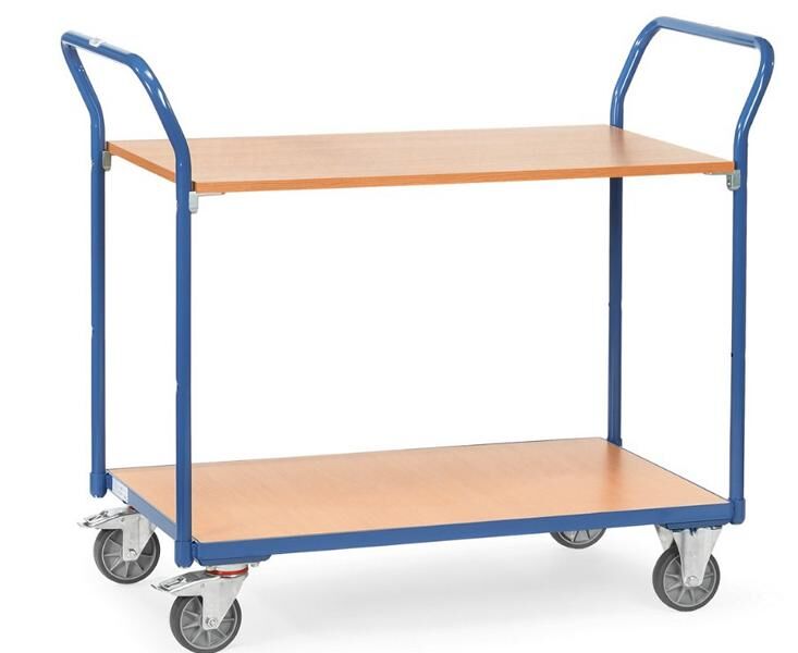 Unsere Fetra Tischwagen im bekannten Baukastensystem mit Stahlrohr-Konstruktion.Die Holzwerkstoffplatten liegen im Rahmen und besitzen ein Buchendekor. Jeweils 2 Lenk- und zwei Bockrollen mit TPE-Bereifung und Naben mit Rillenkugellager ermöglichen einen leichten Transport von bis zu 400 kg. Die Lenkrollen besitzen Feststeller. Die Stahlrohr-Schweißkonstruktion ist blau pulverbeschichtet (RAL 5007). Die Anlieferung erfolgt wie bei Fetra-Produkten üblich zerlegt. Die Montage ist leicht und unkompiliziert.