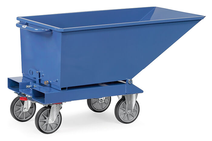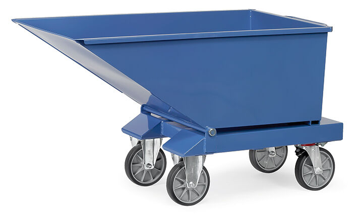 Der fetra Muldenkipper bietet eine kippbar gelagerte Mulde, welche aus 2 mm starkem Stahlblech gefertigt ist. Perfekt geeignet für den unkomplizierten Transport von bis zu 750 kg bzw. 250 Litern. Der obere Rand wird zweimal umgekantet. Die Schüttkante wird doppelt umgelegt. Das Untergestell besteht aus 3 mm starken Kantprofilen mit integrierten Staplertaschen. Ein Trittblech und eine Kippsicherung so wie ein Rohrschiebegriff gewährleisten eine praktische Handhabung. Durch diese Fertigungsart ist die Mulde sehr robust und für einen dauerhaften und langfristigen Einsatz geeignet. Diese Kipper sind öldicht verschweißt und sind daher für verschiedene Güter vielseitig einsetzbar. Der Kippvorgang wird manuell ausgeführt. Ideal für die ebenerdige Entleerung. Serienmäßig mit zwei Lenkrollen mit bewährtem TOTALSTOP-Bremssystem sowie zwei Bockrollen in TPE-Bereifung - gemäß der Europäischen-Norm EN 1757-3. Für die Entleerung mit dem Gabelstapler oder bei schwerer Beladung empfehlen wir einen Kippbehälter oder einen Selbstkipper.