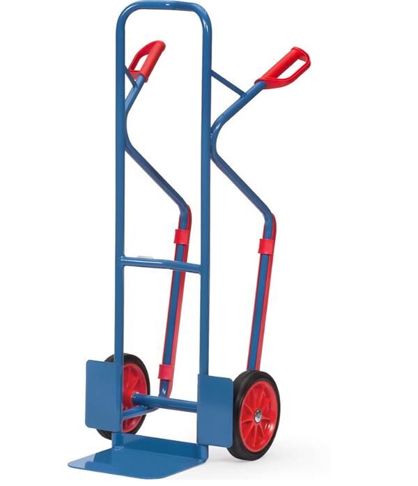 Unsere handlichen Fetra Stahlrohrkarren mit Stahlblechschaufeln gibt es in 14 Ausführungen, sodass für jeden Einsatzzweck das richtige Modell vorhanden ist. Die Karren gibt es sowohl mit Luft- als auch mit Vollgummireifen. Die Naben besitzen Rollenlager. Die Schweißkonstruktion ist äußerst stabil und in blau Pulverbeschichtet (RAL 5007). Die Stahlblechschaufeln sind abschraubbar und die Sicherheitsgriffe ermöglichen einen festen und sicheren Halt während des Betriebes. Die Bügel oben und die Querstreben sind durchgebogen, damit auch runde Güter (Rollen, Kannen, Eimer) sicher transportiert werden können.
