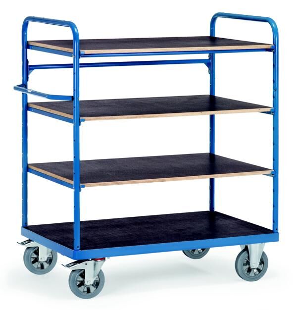 Ein multifunktionales Baukastensystem mit dem bewährten Steck- und Schraubprinzip für einen unkomplizierten, handlichen Transport bis zu 1200 kg. Dieser Super-MultiVario-Transporter lässt sich vielfach verändern, austauschen und ergänzen und ist als Basiswagen bishin zum Etagenwagen erhältlich in 4 Größen von 1000 x 700 bis 2000 x 800 mm. Elegante Rahmenkonstruktion aus "einem Guss" mit "runden Ecken". Hochwertige Pulverbeschichtung in brilliantblau RAL 5007. Im Rahmen liegende Plattformen mit wasserfester und rutschsicherer Siebdruckplatte, Stirnwände ebenfalls mit glatter wasserfester Siebdruckplatte. Serienmäßig mit 2 Lenk- und 2 Bockrollen, Räder mit Elastic-Vollgummi-Bereifung auf Alufelgen, Naben mit Rillenkugellager sorgen für eine hervorragnede Handlichkeit und einen sehr leichten Lauf. Komfortables Schieben durch geringen Rollwiderstand und hohe Elastizität. Lenkrollen mit Feststeller.