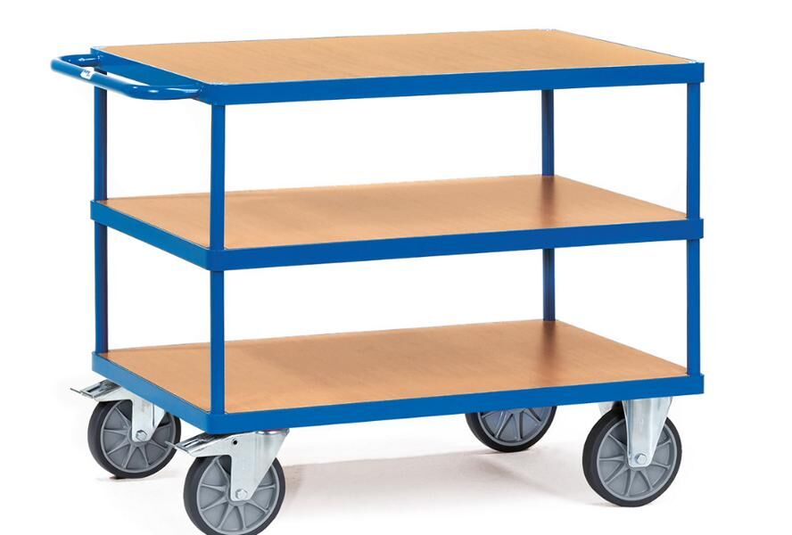 Das multifunktionale Fetra Baukastensystem mit dem bewährten Steck- und Schraubprinzip für einen unkomplizierten, handlichen Kleintransport bis zu 600 kg. Diese Tischwagen lassen sich vielfach verändern, austauschen und ergänzen. Elegante Rahmenkonstruktion aus "einem Guss" mit "runden Ecken". Die Systemteile werden einfach in den Basiswagen eingesteck und festgeschraubt. Eine absolut sichere Verbindung von Rahmen und Stützrohren. Im Rahmen liegende Holzwerkstoffplatten, Oberfläche Buchendekor. Alternativ auch mit Stahlblech-Ladefläche oder Stahlblechwannen. Serienmäßig mit 2 Lenk- und 2 Bockrollen, Räder mit TPE-Bereifung, Naben mit Rillenkugellager. Feststeller an den Lenkrollen. Hochwertige Pulverbeschichtung in brilliantblau RAL 5007.