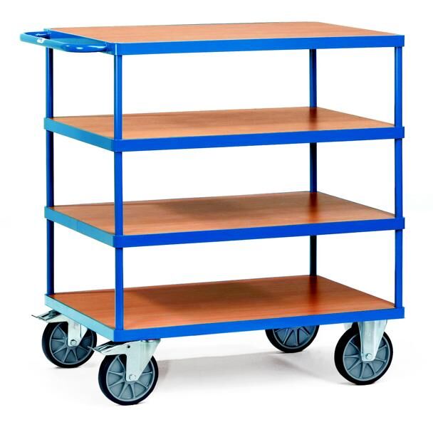 Das multifunktionale Fetra Baukastensystem mit dem bewährten Steck- und Schraubprinzip für einen unkomplizierten, handlichen Kleintransport bis zu 600 kg. Diese Tischwagen lassen sich vielfach verändern, austauschen und ergänzen. Elegente Rahmenkonstruktion aus "einem Guss" mit "runden Ecken". Die Systemteile werden einfach in den Basiswagen eingesteck und festgeschraubt. Eine absolut sichere Verbindung von Rahmen und Stützrohren. Im Rahmen liegende Holzwerkstoffplatten, Oberfläche Buchendekor. Alternativ auch mit Stahlblech-Ladefläche oder Stahlblechwannen. Serienmäßig mit 2 Lenk- und 2 Bockrollen, Räder mit TPE-Bereifung, Naben mit Rillenkugellager. Feststeller an den Lenkrollen. Hochwertige Pulverbeschichtung in brilliantblau RAL 5007.