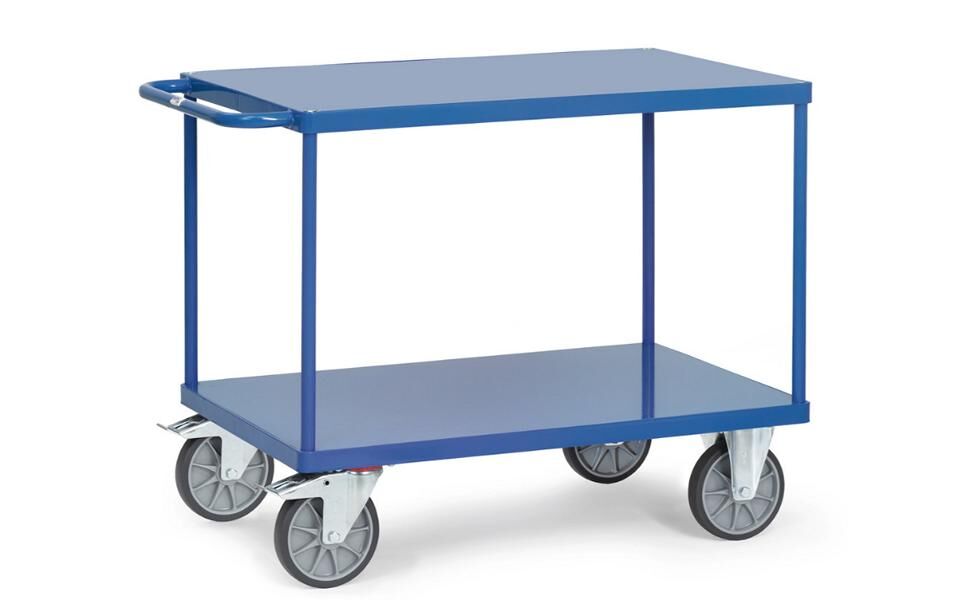 Das multifunktionale Fetra Baukastensystem mit dem bewährten Steck- und Schraubprinzip für einen unkomplizierten, handlichen Kleintransport bis zu 600 kg. Diese Tischwagen lassen sich vielfach verändern, austauschen und ergänzen. Elegante Rahmenkonstruktion aus "einem Guss" mit "runden Ecken". Die Systemteile werden einfach in den Basiswagen eingesteck und festgeschraubt. Eine absolut sichere Verbindung von Rahmen und Stützrohren. Im Rahmen liegende Holzwerkstoffplatten, Oberfläche Buchendekor. Alternativ auch mit Stahlblech-Ladefläche oder Stahlblechwannen. Serienmäßig mit 2 Lenk- und 2 Bockrollen, Räder mit TPE-Bereifung, Naben mit Rillenkugellager. Feststeller an den Lenkrollen. Hochwertige Pulverbeschichtung in brilliantblau RAL 5007.