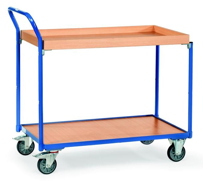 Das multifunktionale Fetra Baukastensystem mit dem bewährten Steck- und Schraubprinzip für einen unkomplizierten, handlichen Kleintransport bis zu 600 kg. Diese Tischwagen lassen sich vielfach verändern, austauschen und ergänzen. Elegante Rahmenkonstruktion aus "einem Guss" mit "runden Ecken". Die Systemteile werden einfach in den Basiswagen eingesteck und festgeschraubt. Eine absolut sichere Verbindung von Rahmen und Stützrohren. Im Rahmen liegende Holzwerkstoffplatten, Oberfläche Buchendekor. Alternativ auch mit Stahlblech-Ladefläche oder Stahlblechwannen. Serienmäßig mit 2 Lenk- und 2 Bockrollen, Räder mit TPE-Bereifung, Naben mit Rillenkugellager. Feststeller an den Lenkrollen. Hochwertige Pulverbeschichtung in brilliantblau RAL 5007.