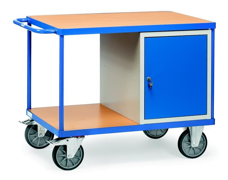 Unsere Werkstattwagen mit Arbeitsplatten bieten besonders viel Stauraum und sind ideal für den innerbetrieblichen Einsatz. Gefertigt aus einer sauber verarbeiteten Profilstahl- / Stahlrohrkonstruktion. Die obere Arbeitsplatte ist aus Holzwerkstoffplatte, Oberfläche Buchendekor. Die Flügeltür- und Schubladenschränke sind in erstklassiger Verabeitung und ausgestattet mit integrierten Griffleisten (nicht vorstehend). Des Weiteren verfügen die Schubladen über einen 4/5-Kugelauszug. Schränke und Schubladen sind durch Sicherheitsschlösser verschließbar. Serienmäßig mit 2 Lenk- und 2 Bockrollen, Räder mit TPE-Bereifung, Naben mit Rillenkugellager. Feststeller an den Lenkrollen. Hochwertige Pulverbeschichtung, Korpus in lichtgrau RAL 7035 und Front in brilliantblau RAL 5007.