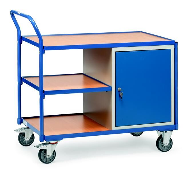Unsere Werkstattwagen mit Arbeitsplatten bieten besonders viel Stauraum und sind ideal für den innerbetrieblichen Einsatz. Gefertigt aus einer sauber verarbeiteten Profilstahl- / Stahlrohrkonstruktion. Die obere Arbeitsfläche ist aus Holzwerkstoffplatte, Oberfläche Buchendekor im Stahlrahmen liegend. Die Flügeltür- und Schubladenschränke sind in erstklassiger Verabeitung und ausgestattet mit integrierten Griffleisten (nicht vorstehend). Des Weiteren verfügen die Schubladen über einen 4/5-Kugelauszug. Schränke und Schubladen sind durch Sicherheitsschlösser verschließbar. Serienmäßig mit 2 Lenk- und 2 Bockrollen, Räder mit TPE-Bereifung, Naben mit Rillenkugellager. Feststeller an den Lenkrollen. Hochwertige Pulverbeschichtung, Korpus in lichtgrau RAL 7035 und Front in brilliantblau RAL 5007.