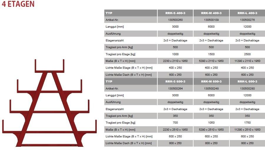 Übersicht der Kragarmregale Typ RRK mit 4 Etagen: