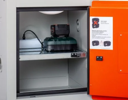 Das Laden und Lagern von Lithium-Batterien (Akkus) darf nur unter Berücksichtigung des Brandschutzes durch geführt werden. Auf Basis aller relevanten Sicherheitsvorkehrungen lassen sich die Entzündungsgefahr (,,Thermal Runaway'') und mögliche Brandfolgen dieser Energiespeicher auf ein Minimum reduzieren. Diese doppelwandigen, wärmeisolierenden Stahlschränke verfügen über einen Rauchmelder mit Akustikwarnton und werden als leichte Brandschutzprodukte für Li-Akkus mit geringer Leistung eingestuft. Ein spezielles Verschlusssystem mit Brandschutzdichtungen gewährleistet ein kaltrauchdichtes Gehäuse. Die abschließbare Tür mit 3-Punkt-Vierriegelung kann bei Bedarf mit einem Vorhängeschloss verschlossen werden (Profilhalbzylinder schließanlagenfähig). Für mehr Flexibilität beim Positionieren oder Evakuieren im Havariefall, kann der Schrank unterfahren werden. Aufgrund der Einlegeböden können die Akkus einfach und übersichtlich verstaut werden. Jeder Schrank verfügt über eine Entlüftungsöffnung zum bestimmungsgemäßen Anschluss an ein Abluftrohr. Die Türen des Akku-Lagerschranks werden in einer hochwertigen Lackierung in hellorange, so wie einem Korpus in grau geliefert, die sich, neben der ansprechenden Optik, durch eine hohe Langlebigkeit auszeichnet und ideal für den Einsatz im gewerblichen Umfeld ist. Warnaufkleber und Sicherheitshinweise sind inklusive. Die Schränke sind in 3 Größen erhältlich: Typ US (2 Lagerebenen, optional auch als Ladeschrank erhätlich), Typ S (3 Lagerebenen) & Typ L (4 Lagerebenen).