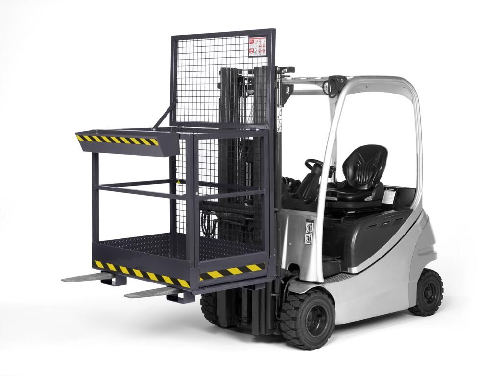 Unsere neuen Arbeitskörbe, aus der Modellreihe RAK, für Gabelstapler und andere Flurförderfahrzeuge mit Gabelzinken bieten Sicherheit bei der Reparatur- und Wartungsarbeiten an hochgelegenen Gebäudeteilen, Maschinenanlagen, Deckenbeleuchtungen, Inventuraufnahmen etc. und die entsprechend den Unfallverhütungsvorschriften (UVV). Durch die robuste Stahlkonstruktion und rutschsichere Arbeitsplatte bieten diese Arbeitsbühnen sicheres Arbeiten in den verschiedensten Höhen. Die Sicherung am Gabelstapler erfolgt durch eine Steckbolzensicherung hinterm Gabelrücken und verhindert so das Abrutschen von den Gabelzinken. Der Arbeitskorb ist Serienmäßig mit einer Werkzeugablage ausgestattet und gefertigt nach BGVD 27.03 (Flurförderzeuge) und Merkblatt der Großhandel- und Lagereiberufsgenossenschaft U048.03.
