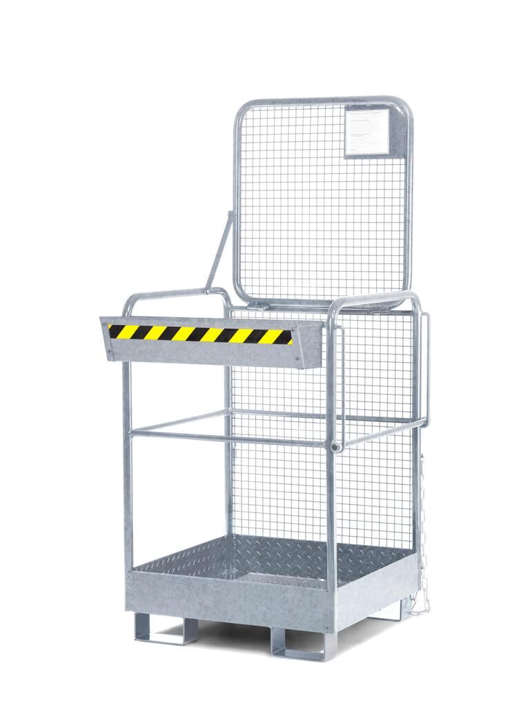 Unsere neuen Arbeitskörbe, aus der Modellreihe RAK, für Gabelstapler und andere Flurförderfahrzeuge mit Gabelzinken bieten Sicherheit bei der Reparatur- und Wartungsarbeiten an hochgelegenen Gebäudeteilen, Maschinenanlagen, Deckenbeleuchtungen, Inventuraufnahmen etc. und die entsprechend den Unfallverhütungsvorschriften (UVV). Durch die robuste Stahlkonstruktion und rutschsichere Arbeitsplatte bieten diese Arbeitsbühnen sicheres Arbeiten in den verschiedensten Höhen. Die Sicherung am Gabelstapler erfolgt durch eine Steckbolzensicherung oder Kettensicherung (RAK-One) hinterm Gabelrücken und verhindert so das Abrutschen von den Gabelzinken. Der Arbeitskorb ist Serienmäßig mit einer Werkzeugablage ausgestattet und gefertigt nach BGVD 27 (Flurförderzeuge) und Merkblatt der Großhandel- und Lagereiberufsgenossenschaft U048.03.