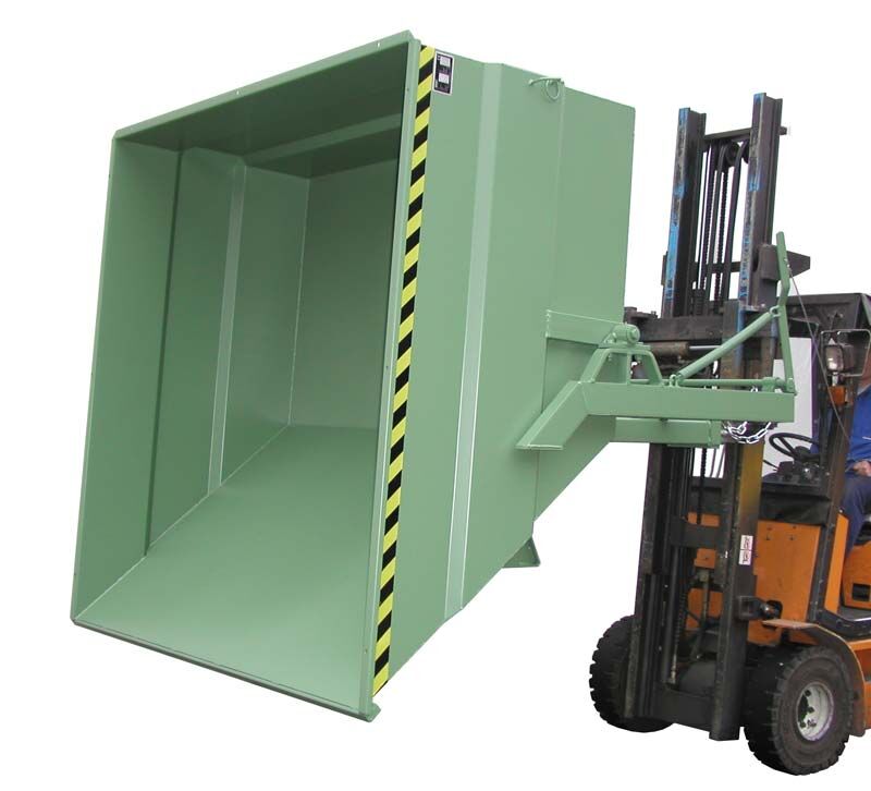 Unsere Stapler-Kippbehälter des Typen BKC zeichnen sich durch ihr großes Volumen und ihrem seitlichen Drehlager aus. Ab dem Typen BKC 400 wird der Großraumbehälter mit einem Aufsatzrahmen geliefert. Die Entleerung des Großraumkippers erfolgt über einen Seilzug, welcher das Kippen vom Staplersitz aus ermöglicht. Auf Wunsch kann der Behälter auch mit einer hydraulischen Kippvorrichtung, einer einstellbaren Kippbremse oder einem verzinktem Deckel ausgestattet werden. Der Abfallbehälter besteht aus einem stabilen Grundrahmen mit Einfahrtaschen, somit kann er ohne Probleme mit einem Gabelstapler aufgenommen werden. Die zusätzliche Sicherung gegen unbeabsichtigtes Abrutschen und Auskippen sorgt für eine optimale Sicherheit für Sie und ihre Mitarbeiter. Zusätzliche Sicherheit bietet das umlaufende Randprofil.