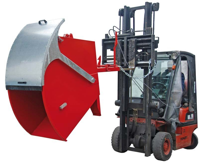 Die Runddeckel-Kippbehälter vom TYP RD, wie bspw. der Stapler-Kippbehälter RD-1000 mit Runddeckel, werden immer serienmäßig mit einem besonders dicht schließenden Runddeckel ausgeliefert, so dass der Inhalt vom Stapler-Kippbehälter RD-1000 mit Runddeckel besonders gut vor Witterungseinflüssen geschützt ist. Je nach Ausführung können diese Anbaugeräte für Gabelstapler 1500kg transportieren und ein Volumen von max. 1cbm aufnehmen.