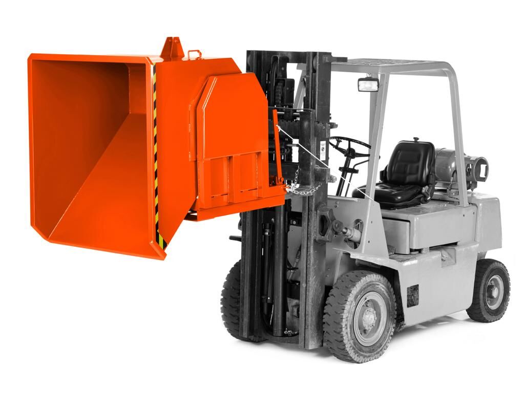 Unsere robusten Muldenkipper Typ RMK eignen sich ideal zum Sammeln und Transportieren von schweren Produktionsrohstoffen und Betriebsabfällen. Dank eines 3 mm Stahlblechs mit umlaufender Randverstärkung und einem Grundrahmen aus 6 mm Stahlblech mit Querverstärkung ist der Behälter sehr langlebig. Für maximale Sicherheit befindet sich eine Sicherungskette an dem Behälter, die ein unbeabsichtigtes Abrutschen von den Gabelzinken verhindert. Die Kippbehälter werden mit einer hochwertigen Pulverbeschichtung und Gelb/schwarzen Warnstreifen gem. Kennzeichnungspflicht ASR A 1.3 ausgestattet.