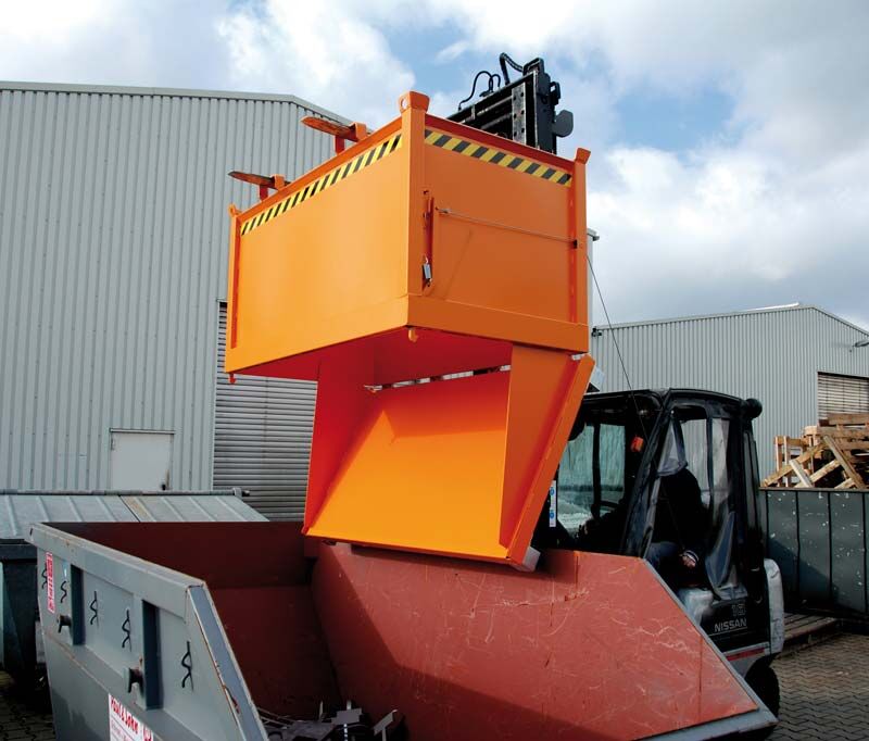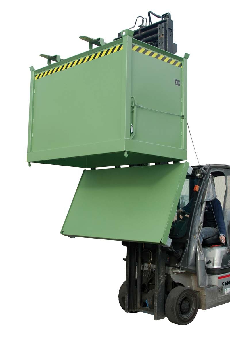 Unsere robusten Klappbodenbehälter sind ideal zum Sammeln, Lagern und Umfüllen von Wertstoffen. Aufgenommen werden diese Behälter mit einem Gabelstapler über die oberhalb angebrachten Einfahrbügel (Zinkenlänge beachten) oder mit einem Kran an den vorhandenen 4 Kranösen. Durch die 100 mm Unterfahrhöhe lassen sich diese Behälter auch mit einem Gabelhubwagen transportieren.