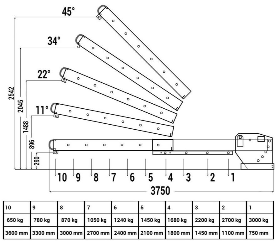 | Hakenpositionen (Auslage): | 1100 - 3600 mm |