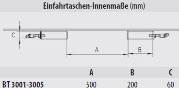 - Einfahrtaschen-Innenmaße: A 500 | B 200 | C 60 mm
