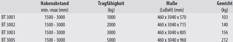 | Typ | Tragfähigkeit (kg) | Maße ca. (LxBxH mm) | Hakenabstand min.-max. (mm) | Gewicht (kg) |