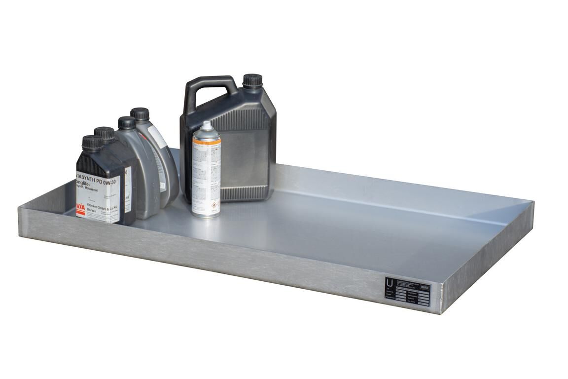 Kleingebindewannen wahlweise aus 3 mm verzinktem Stahlblech oder 2 mm Edelstahl. Speziell für die Lagerung von Kleingebinden.