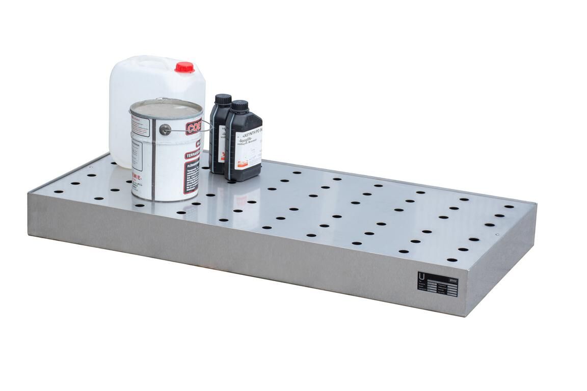 Kleingebindewannen mit Lochblechrost aus 2 mm Edelstahl. Speziell für die Lagerung von Kleingebinden.