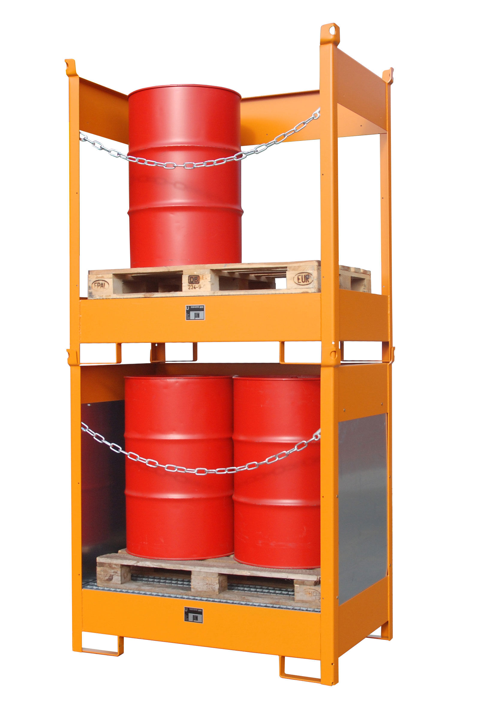Fässer platzsparend und sicher Lagern. Mit unseren Fass-Stapelpaletten lassen sich 1 bis 4 Fässer á 200 Liter Lagern und mit Hubwagen oder Gabelstapler Transportieren. Ausgestattet mit Gitterrost, Einfahrbügeln und Kranösen lässt sich diese Auffangwanne bzw. Stapelpalette mit einem Gabelstapler, Hubwagen oder auch mit einem Kran bewegen. Auch diese Auffangwannen sind TÜV-Geprüft und geeignet für die Lagerung von entzündbaren Flüssigkeiten der GHS-Kategorien 1-3 (bzw. den Gefahrensymbolen F / F+) sowie gewässergefährdenden Flüssigkeiten der GHS-Kategorien 1-4 (bzw. WGK 1-3).