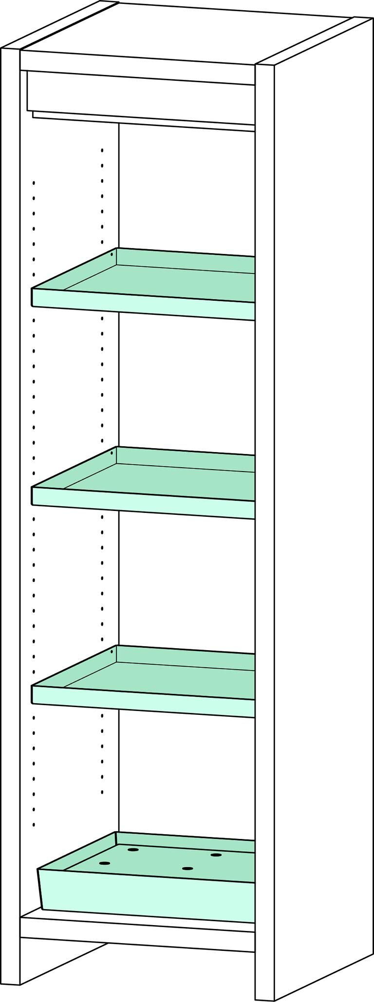 - 3 höhenverstellbare Wannenböden (Tragkraft 75 kg) aus Stahlblech gepulvert in lichtgrau RAL 7035 - Lochrastermaß 32 mm