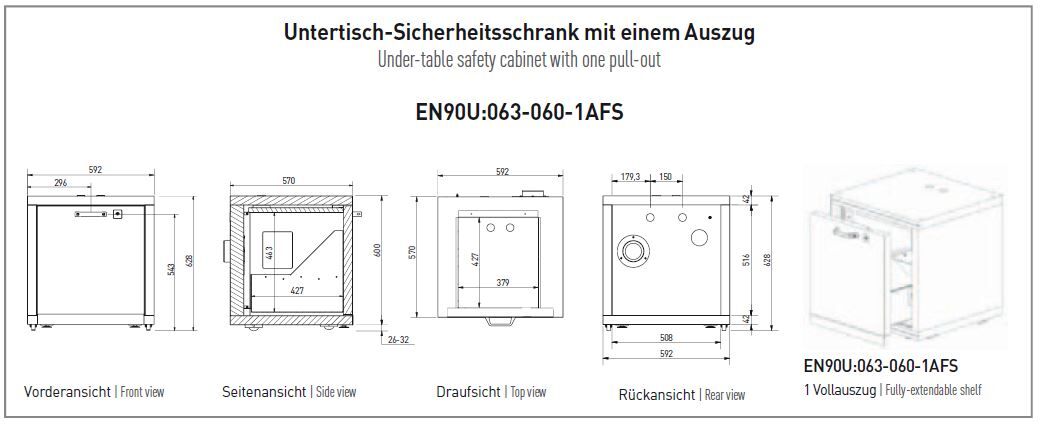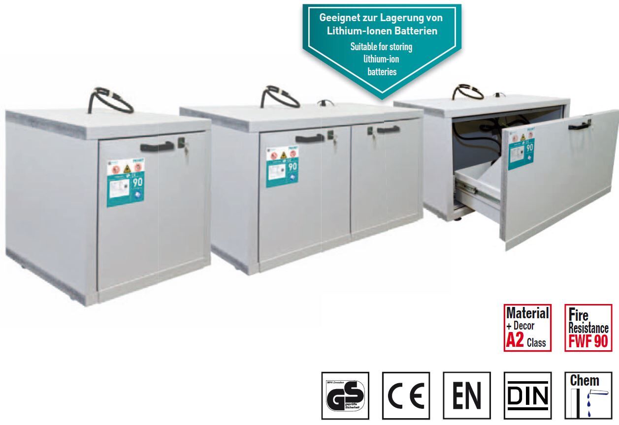 Unsere feuerbeständigen Untertisch-Auszugsschränke sind optimal geeignet für die Lagerung von zum Beispiel Gefahrstoffen am Arbeitsplatz oder in Arbeitsräumen. Aber auch wichtige Dokumente, Arzneimittel, Proben, Batterien ec. sind mit einer Feuerbeständigkeit von bis zu 90 Minuten vor Flammen geschützt. Durch die Erfüllung der Labormöbelnorm (EN 14727) ist die Einhaltung von wichtigen Qualitätsmerkmalen, wie zum Beispiel die Festigkeit, Dauerhaltbarkeit und die Sicherheit, unserer Sicherheitsschränke gegeben. Somit sind unsere Sicherheitsschränke selbst für die Aufstellung in einem Labor geeignet. Im Falle eines Brandes schließt sich die Schublade selbstständig. Auch die Be- und Entlüftungsöffnungen schließen sich im Fall eines Brandes selbstständig.